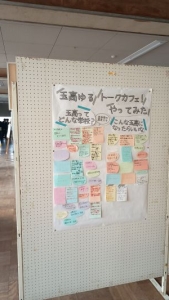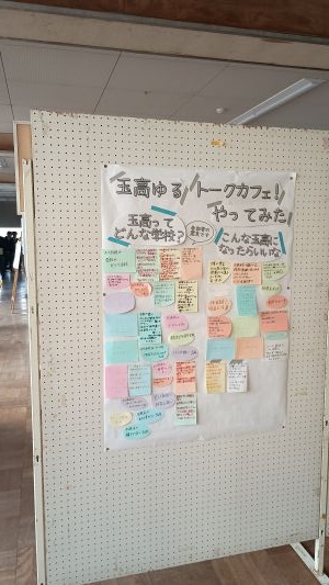 10月31日(金曜日)の放課後に「玉高ゆるトークカフェ」を開催、2年生8名、1年生4名が参加しました。お菓子を食べながら、「玉高ってどんな学校?」「こんな玉高になったらいいな」というテーマについて、参加者がカードに記入し交流しました。ゲストにユースワーカーの今井さんをお迎えし、他校の様子などを聞いて客観的に玉川高校の現状や課題について考えることができま.した。ゆるトークで出された生徒の意見は、生徒ホール横に掲示しています。今後は、生徒会と連携しながら、生徒の声をいかした学校づくりを進めていく予定です。