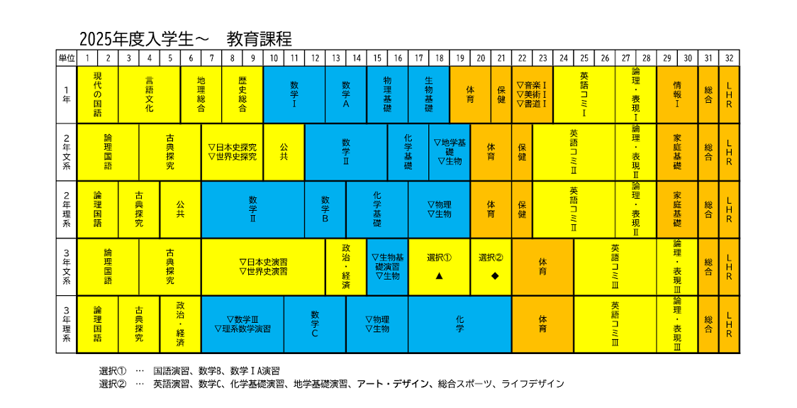 - 2年生 各自の希望する進路に従って文系、理系いずれかコースを選択